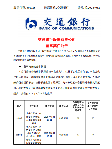 8月16日股票配资入门平台,交通银行股份有限公司发布董事离任公告,。李龙成先生因年龄原因,向本公司董事会提请辞去非执行董事、审计委员会委员、人事薪酬委员会委员职务;汪林平先生因年龄原因,向本公司董事会提请辞去非执行董事、战略委员会(普惠金融发展委员会)委员、风险管理与关联交易控制委员会委员,辞任自2025年8月15日起生效。