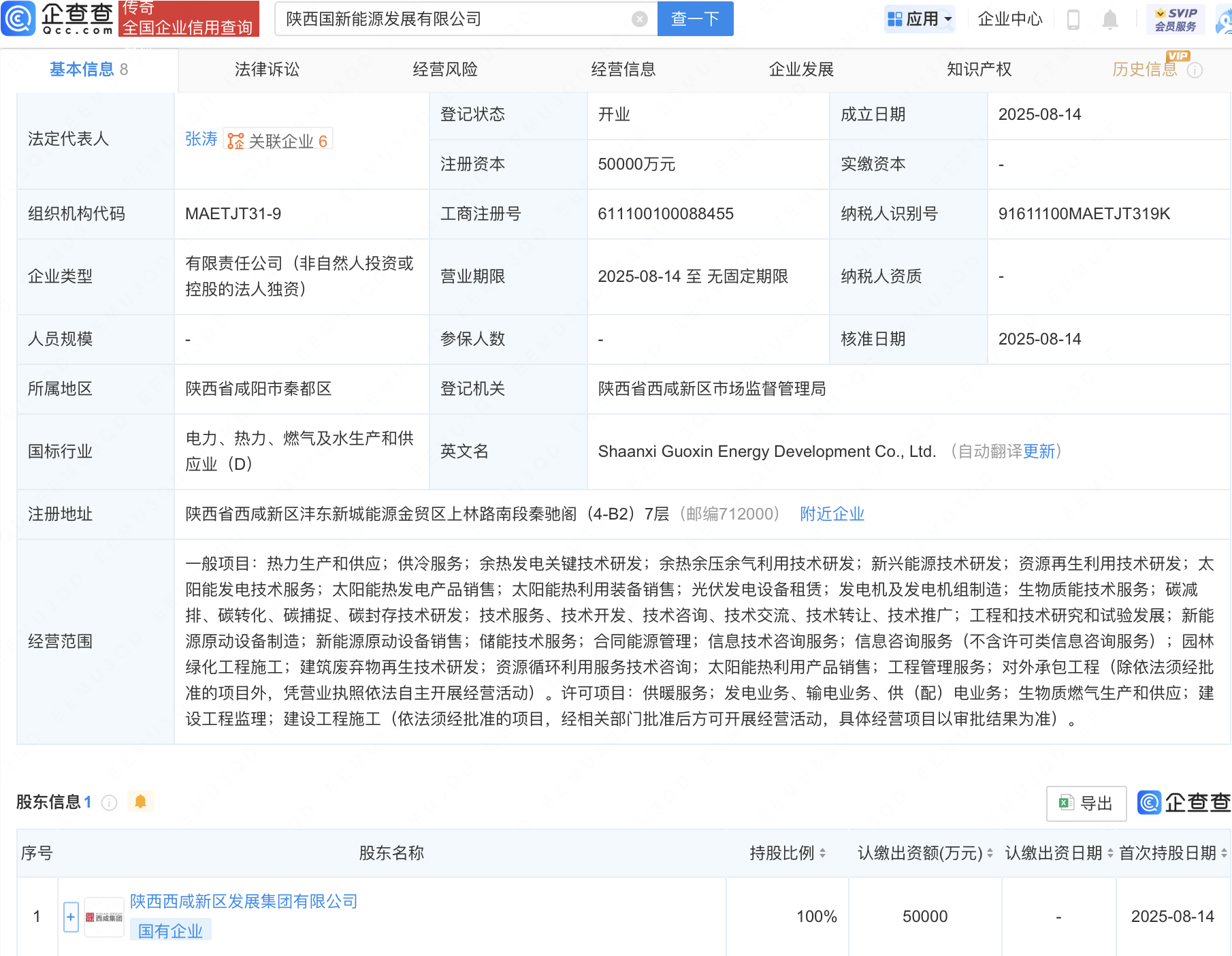 近日,陕西国新能源发展有限公司成立,注册资本5亿元股票怎么配资的,经营范围包含:热力生产和供应;供冷服务;余热发电关键技术研发;余热余压余气利用技术研发等。企查查股权穿透显示,该公司由陕西西咸新区发展集团有限公司全资持股。